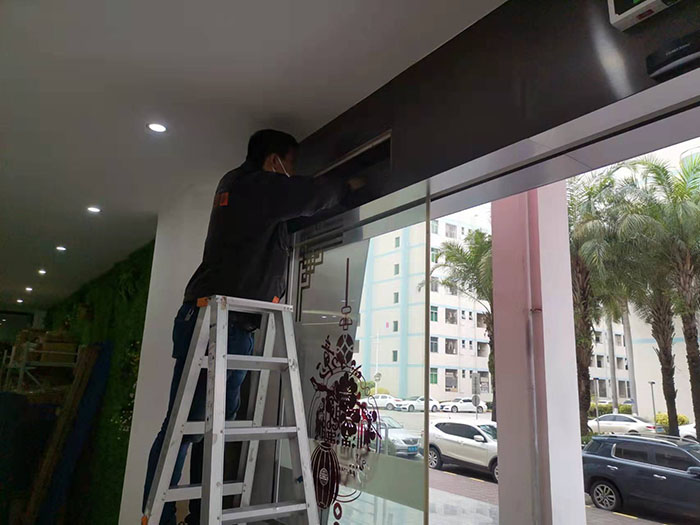 今天上午我们去石岩宏发科技园维修自动门,这次我和同事胡师傅一起过来的,这次主要是解决自动门异响的问题,上个星期我有来过这里检修过一次,当时发现自动门异响是自动门尾轮和滑轮造成的,需要更换。于是今天来了两个师傅,因为玻璃门太高了,为了安全起见需要两个人一起操作,首先更换滑轮,两个人先把玻璃门垫高,然后更换滑轮,更换滑轮,更换尾轮,再通电这一次就没有声音了,之前自动门运行的声音就是那个些滑轮造成的,由于自动门每天在开关运行,磨损很严重是,更换新的滑轮就可以解决自动门开关噪音。调试好自动门之后,客户试了好几次,觉得很好用,于是很快给我们结清了费用。